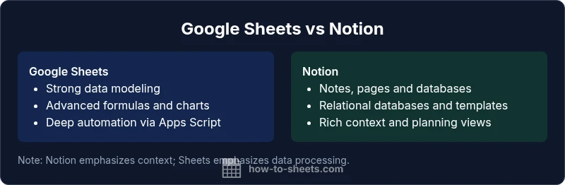 When evaluating google sheets vs notion, the first difference to note is their core purpose. Google Sheets is a spreadsheet application designed for numeric data, calculations, dashboards, and automation through scripts and add-ons. It excels at handling large datasets, building models, and producing live charts that update as data changes. Notion, by contrast, is a flexible knowledge workspace that combines pages, databases, and templates into a unified interface. It emphasizes context, organization, and collaboration around content rather than pure data crunching. For teams, this means Sheets often becomes the data engine, while Notion becomes the knowledge, planning, and documentation hub. In practice, many teams adopt a hybrid approach: store operational data in Sheets and link or embed it within Notion pages for context, roadmaps, and decision logs. This juxtaposition—google sheets vs notion—highlights a broader decision: data-centric workflows versus knowledge-centric workspaces. As you compare the two, recognize where your team’s work lives today and where it could benefit from tighter integration or clearer separation. The How To Sheets framework emphasizes choosing the right tool for the task at hand, then designing a workflow that minimizes friction between data and context.