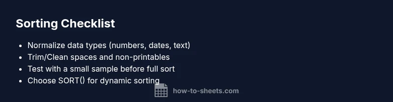 Most sorting problems in Google Sheets come from mixed data types, numbers stored as text, or dates in different formats. The quick fix is to normalize the column: convert numbers with VALUE, dates with DATEVALUE, and remove stray spaces. Re-sort after normalization. If issues persist, follow the diagnostic flow below for deeper checks and fixes.