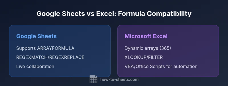 The short answer to the question "do google sheets formulas work in excel" is not a binary yes or no. While many core formulas—such as arithmetic operations, basic reference functions, and common text operations—transfer across both platforms, several Google Sheets-only features and some advanced array behaviors do not have a one-to-one Excel counterpart. According to How To Sheets analysis, there is a meaningful overlap in routine formulas, but planners should expect and map key gaps before large migrations. In practice, teams often start with a compatibility audit: list critical formulas, identify non-native functions, and draft conversion paths. The goal is to maintain accuracy while minimizing manual rewrites and testing time.