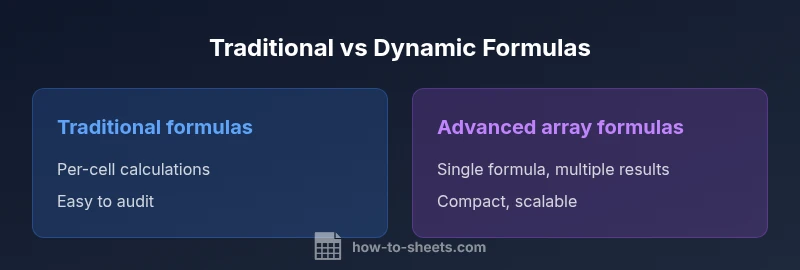 Traditional formulas evaluate per cell and are straightforward to read, while advanced array formulas output multiple results with a single expression. Both approaches can solve the same problems, but their structure and maintenance differ.