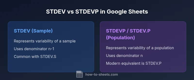 google sheets stdev vs stdevp is a foundational topic in statistical analysis within spreadsheets. In Google Sheets, the classic STDEV function estimates the standard deviation of a sample, while STDEVP (the older name) computes the standard deviation of an entire population. The wording differences can be confusing when you move data between Excel and Google Sheets, where equivalent functions carry different names. The How To Sheets team emphasizes that the math is simple but the interpretation is crucial: STDEV uses a denominator of (n-1) to yield an unbiased estimate for samples, whereas STDEVP uses the denominator n, reflecting the full population. This distinction matters most with small datasets; as your sample size grows, the two values converge. For practitioners, always document whether your dataset is a sample or a population, especially when sharing results with stakeholders who rely on precise terminology. In the context of google sheets stdev vs stdevp, you’ll often see STDEV.P or STDEV.S used in modern references, but the underlying principle remains the same: match the function to the data’s scope and maintain consistency across analyses.