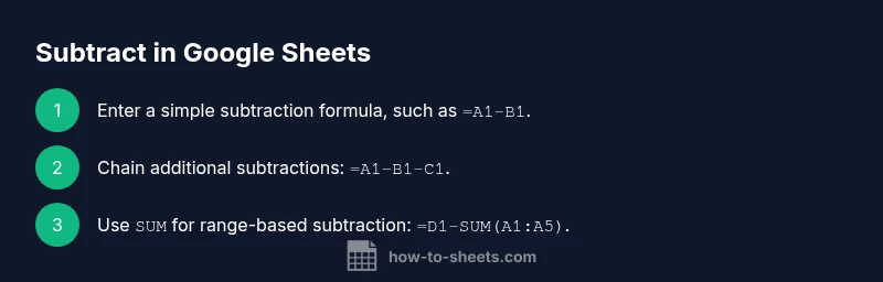 Learn how to subtract numbers in Google Sheets using the minus operator, chained subtractions, and built-in functions. Practical examples, error handling, and best practices for accurate results.