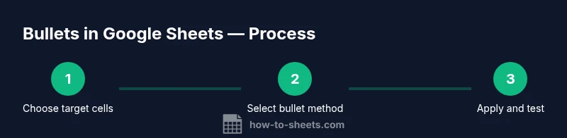 Bullet lists in Google Sheets boost readability by clearly outlining items, steps, and categories. When data is presented as bullets, readers can scan for key points quickly, which is especially helpful in project plans, budgets, task trackers, and student rubrics. According to How To Sheets, adopting a consistent bullet style improves readability and scannability in spreadsheets used by teams or instructors. If your workbook will be viewed on different devices or OSes, sticking to a simple, universal symbol like • (Unicode 2022) minimizes rendering issues. In this section we’ll explore why bullets matter, and how to choose a method that fits your data and workflow. The aim is to give you practical, ready-to-use techniques you can apply today across single cells or entire columns, while preserving data integrity and ease of editing. By the end, you’ll know when to use formulas, keyboard shortcuts, or automation to keep bullets uniform.