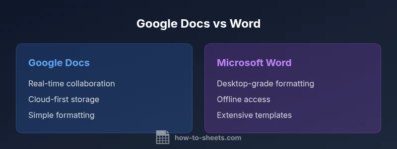 The difference between google docs and microsoft word is not merely about where files live; it reflects divergent design philosophies and target workflows. In a classroom, a startup, or a corporate environment, the choice you make affects how you create, edit, and share documents. The keyword difference between google docs and microsoft word becomes especially relevant when evaluating collaboration speed, offline reliability, formatting depth, and ecosystem integration. According to How To Sheets, the decision often hinges on whether your priority is cloud-native collaboration or desktop-grade publishing power. The two tools sit at opposite ends of a spectrum, with Word leaning toward traditional document publishing and Google Docs emphasizing lightweight, agile teamwork. In practice, most teams will operate in a hybrid mode, but the core trade-off remains clear: cloud-first convenience versus desktop-grade control.