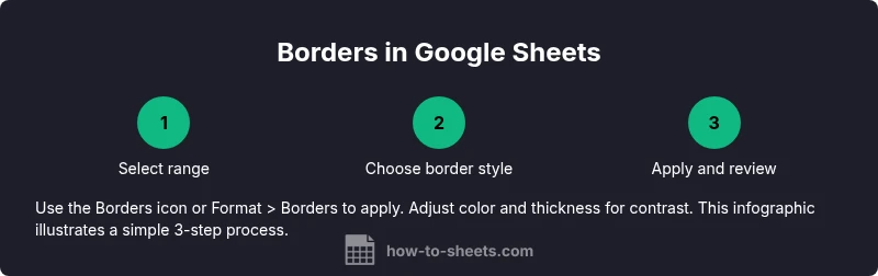 A border is a visible line that you can apply to one or more cells to define boundaries, separate sections, or emphasize totals. In contrast to the default gridlines that appear on every sheet, borders are intentional formatting choices you control. By using borders strategically, you can guide readers through a data table, highlight headers, and create printable layouts that look polished. According to How To Sheets, borders are one of the simplest yet most effective tools for improving data legibility without changing content. Understanding when and where to place borders is the first step toward clean, navigable spreadsheets. The term google sheets border refers to the set of lines you apply to cell edges—top, bottom, left, and right—individually or as a group. In practice, you’ll combine borders with shading, font weight, and alignment to achieve consistent, professional results.