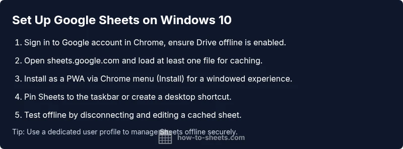 There are two practical ways to use Google Sheets on Windows 10: through a browser, or as a Progressive Web App (PWA). In a browser, you simply go to sheets.google.com and sign in. For a more app-like experience, install Sheets as a PWA via Chrome: open Sheets, click the three-dot menu, choose Install, and follow prompts. You’ll get a dedicated window, quicker launch, and offline support if enabled. If you need to alternate, you can create a desktop shortcut that launches Sheets in a standalone window, improving focus and reducing tab clutter.
