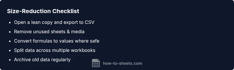 In multi-user environments, large sheets get bloated faster. Establish data governance habits: limit embedded images, avoid copying entire sheets, and use version history to track changes. Encourage contributors to store old data in separate files and link to current data via IMPORTRANGE rather than duplicating. Document naming conventions and cleanup schedules, so future contributors understand the clean-up rules. Regular communication minimizes surprises and keeps the file lean enough to open reliably. How To Sheets emphasizes a collaborative, scalable workflow to prevent reoccurrences.