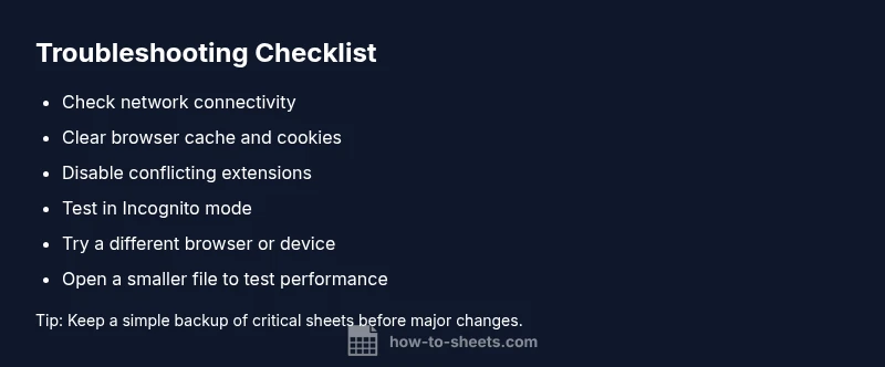 If google sheets is not opening or behaving oddly, start with basic checks. Verify your internet connection, clear the browser cache, and disable conflicting extensions. If needed, reload the page or try Incognito mode, then test a small file. These quick steps resolve most common issues quickly. If that doesn't help, reload the page, sign back in, and try a smaller file to rule out data corruption. If issues persist, consult the diagnostic flow below for deeper troubleshooting.