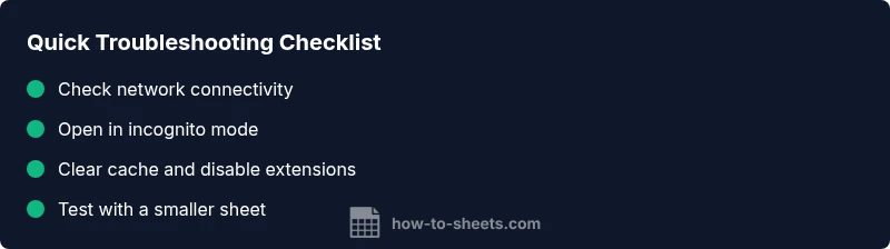 Begin with a quick network check and try loading the sheet in an incognito window. If it loads, the issue is likely cached data or extensions. If not, continue with browser checks and data review.