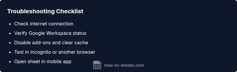 Is google sheets not working? This urgent troubleshooting guide helps you diagnose issues, fix formulas, add-ons, offline access, and connectivity problems quickly.