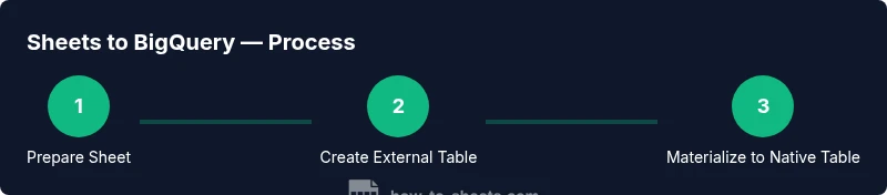 This section outlines a robust workflow that starts with a read-only external table linked to a Google Sheet, followed by materializing data into a standard BigQuery table. This preserves the Sheet as the source of truth while enabling fast analytics in BigQuery.