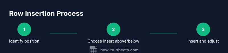 Follow these practical steps to insert a row using the Google Sheets menu. First, click the row header where you want the new row to appear (the new row will be inserted relative to this row). Second, open the Insert menu at the top and select Row above or Row below, depending on where you want the new space. Third, review the new row to ensure headers align and any merged cells or formatting remain intact. If you’re inserting into a protected sheet, confirm you have editing rights before proceeding. This method is intuitive and works well when you’re not memorizing keyboard shortcuts.