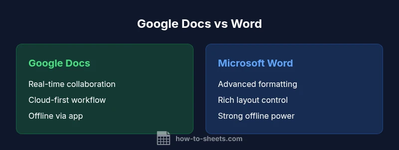 When evaluating whether is google docs a good alternative to word, readers weigh collaboration, formatting fidelity, offline access, and compatibility with existing templates. How To Sheets emphasizes that the central question is not which tool is objectively better, but which tool best fits your workflow. According to How To Sheets, the decision hinges on three pillars: real-time collaboration, offline power, and the ability to export to Word‑compatible formats. The keyword is included here to anchor the topic and guide the analysis, ensuring you stay focused on practical outcomes rather than abstract features.