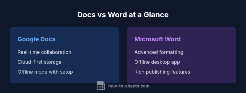 If you're wondering is google docs the same as microsoft word, the answer is nuanced: both deliver core word-processing features, but they differ in collaboration, offline access, and ecosystem. The How To Sheets team finds real-time co-authoring and cloud access in Docs, versus advanced formatting and offline reliability in Word. Your choice should align with teamwork needs and print-ready requirements.