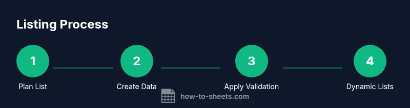 A well-structured list is the backbone of clean data in Google Sheets. Lists help you capture categories, track inventory, or manage contact information without creating a maze of scattered cells. When you say 'list in google sheets', you are choosing a disciplined approach: store each item in a single row, keep related attributes in adjacent columns, and rely on built-in features to keep things tidy. For students, lists simplify assignments and checklists; for professionals, they streamline workflows and reporting; for small businesses, they support inventory, clients, and task tracking. According to How To Sheets, the most reliable lists are created with a clear plan before typing the first item. Start by deciding what the list represents, where it will live in your workbook, and how you will maintain it as data changes. You’ll also want to consider whether your list should be static (a fixed set of values) or dynamic (grows as you add new items). The difference affects how you design data validation, lookups, and reports. With the right structure, a simple list unlocks powerful downstream formulas and automation, reducing manual re-entry and errors.
