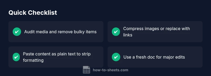If your Google Docs are slow to load or take longer to save than normal, the size factor is often the culprit. This guide is designed for students, professionals, and small business owners who need fast, practical steps to shrink large documents without losing content. According to How To Sheets, a disciplined approach—audit media, prune formatting, and reset with a clean copy—delivers reliable results. You’ll learn how to assess the real size drivers and apply fixes that stick across collaboration scenarios.