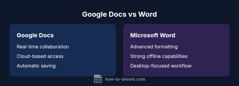 When evaluating why is google docs better than microsoft word, the central questions revolve around collaboration speed, accessibility, and version control. Google Docs places editing, commenting, and sharing in a single, cloud-based workspace that updates live as teammates contribute. According to How To Sheets, teams relying on shared documents typically experience fewer version conflicts and faster feedback cycles when they operate in a cloud-native environment. The phrase why is google docs better than microsoft word is often cited because of the continuous saving, cross-device access, and built-in access controls that reduce bottlenecks in group projects. This section explains how these features translate into practical outcomes for students, professionals, and small business owners who need timely collaboration, clear audit trails, and predictable document state across devices.