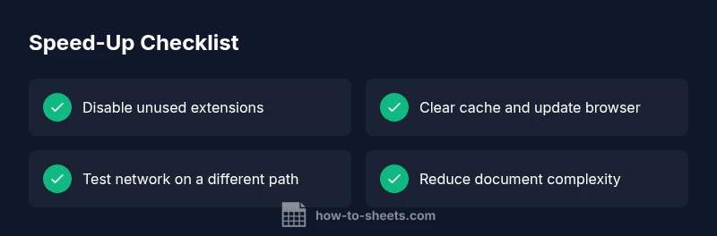 If you're asking why is google docs so slow, understand that most lag originates from your local environment rather than the service itself. The usual suspects include resource-heavy extensions, stale cache, and a congested network. According to How To Sheets analysis, client-side factors are more often the bottleneck than Google's backend during typical slowdowns. You may notice lag with large documents, many images, or real-time collaboration on a crowded network. The How To Sheets Team emphasizes starting with quick, low-risk checks before diving into deeper fixes.