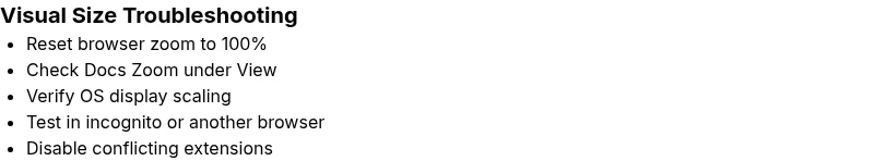 - Verify Across Devices: If a single device shows the issue, check accessibility settings or DPI scaling on that device. If multiple devices show the issue, focus on browser or Docs settings.