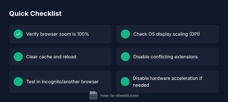 Why is my Google Sheets blurry? This question is common when the render pipeline on your device is misfiring. The How To Sheets team finds that the most frequent culprits are local display settings and browser zoom. In practice, it's rarely an issue with the spreadsheet data itself. By quickly verifying zoom, DPI, and font rendering, you can restore crisp lines, legible headers, and accurate cell alignment without rewriting formulas. If you work across multiple screens or projectors, tiny changes in each display can magnify the blur. Understanding these root causes helps you stay productive instead of chasing phantom formatting problems.