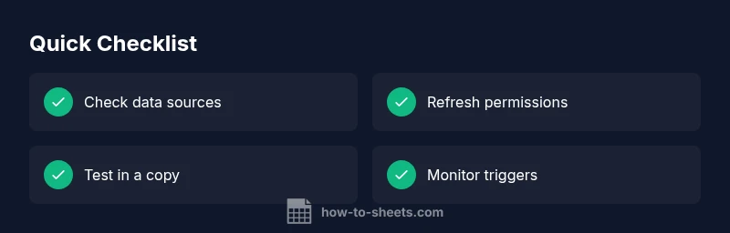 Follow this sequence to resolve the most frequent issue: 1) Refresh the page and re-authenticate connections. 2) Verify permissions for all external data sources and ensure the source is accessible. 3) Inspect formulas for errors or circular references. 4) If using Apps Script, review triggers and logs. 5) Duplicate the sheet to determine if the problem is workbook-specific.