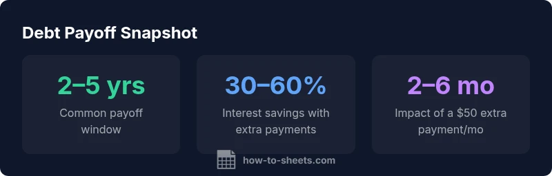 Understanding the path to debt freedom starts with clear visibility. A debt payoff calculator google sheets gives you a live, editable model of how your balances shrink over time as you pay more or less each month. With this tool, you can compare strategies (snowball vs avalanche), test how extra payments affect outcomes, and share a transparent plan with mentors, partners, or lenders. The goal is to turn abstract numbers into a concrete schedule you can follow. The How To Sheets team emphasizes that a well-structured spreadsheet empowers you to experiment safely and build confidence in your repayment plan.