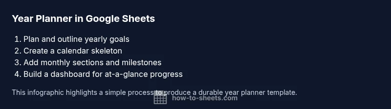 A year planner in Google Sheets helps students, professionals, and small business owners turn annual goals into actionable steps. A well-structured planner keeps deadlines visible, tracks milestones, and aligns team efforts across months. The convenience of Google Sheets means you can access the planner from anywhere, share with teammates for real-time updates, and customize layouts without specialized software. According to How To Sheets, a practical year planner should balance high-level yearly vision with concrete monthly actions, avoiding over-automation that makes maintenance harder. Start with a simple layout and iteratively add features as your needs grow. In 2026, many teams rely on scalable templates that can be copied and adapted for new projects, academic terms, or fiscal years. This article walks through a proven approach to building such a planner from scratch, plus tips for keeping data consistent as plans evolve. It also highlights the differences between a standalone calendar and a dashboard-style overview, so you can choose the pattern that best suits your workflow. If you’re new to Google Sheets, don’t worry—the steps are designed to be accessible, and you’ll learn handy techniques you can reuse in other projects. By the end, you’ll have a living template that supports goal setting, progress tracking, and cross-functional coordination throughout the year. Let’s begin by outlining the core features you’ll want to include.